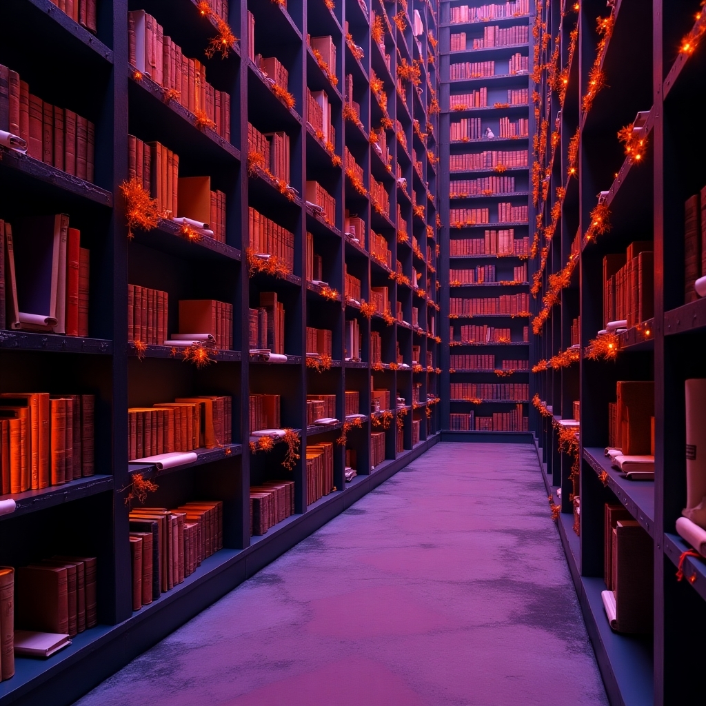 The shelves touched the ceilings only able to be traversed by tall bronze ladders and mezzanines with marble balustrades. the shear amount of written words would rival any grand library.