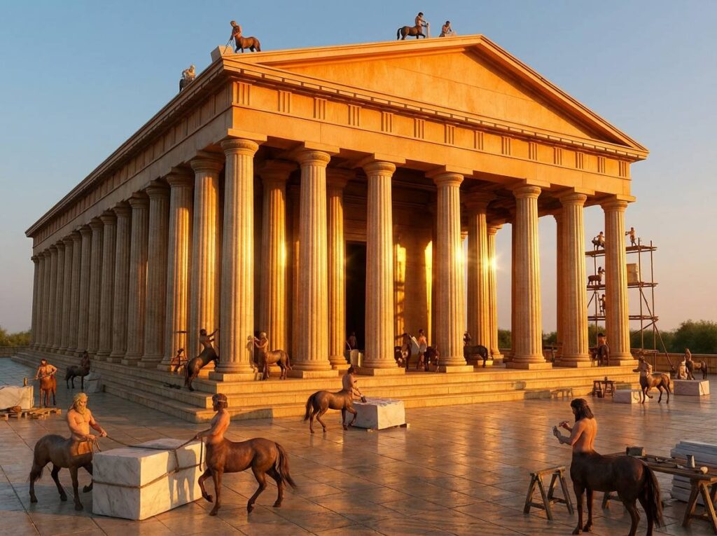 HTML temple is a building of great stature 85 meters by 50 meters with its perimeter of granite and marble columns, polished to reflect sunlight adding to interior illumination, front facing the sun’s rise for optimal light. It’s a doric peristyle wonder with Orange Pentelic marble facade
